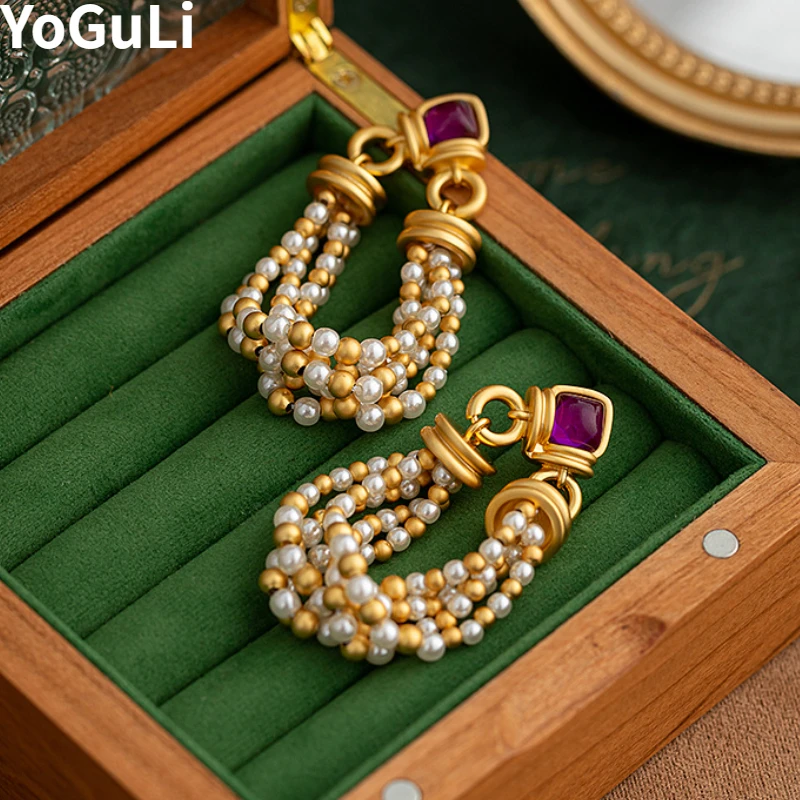 Retro Jewelry Senior Sense Purple Resin Simulated Pearl Bead Tassel Earrings